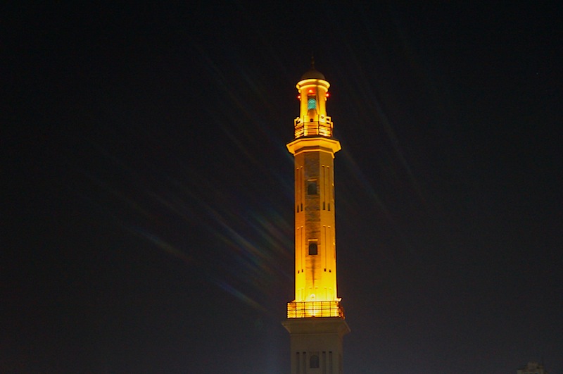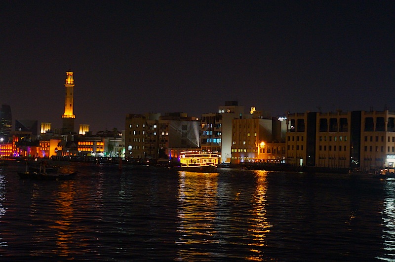 After dinner, we brought the rest of our wine and plate of somewhat palatable desserts up to the top level of the boat, to get some fresh air. I had noticed that we stopped circling and were heading out to the sea, down the Dubai creek. The scenery had improved, with many of the buildings lit up nicely. I was thrilled that we could at least enjoy the last hour of the three hour tour on top of the boat, but was also thrilled when the boat turned around and made its way back to the dock.