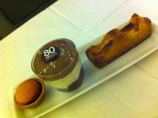 The choices for dinner included a pan-seared tenderloin of beef, a lightly spiced sautéed chicken, a risotto with cepe mushrooms, and a shrimp dish. By the time they got to my row of business class, they had run out of meal selections. Again. So, I was stuck with the palatable, but strange looking shrimp, orange, and potato – the dish was almost fluorescent in its shade of orange and green. It was created by some fancy French chef, with some fancy French name, who has apparently won some fancy French food awards. Maybe I am not fancy enough to appreciate the extreme balsamic vinegar taste. At least it wasn’t a stinky airplane fish. I enjoyed the selection of cheese and the trio of desserts along with a freshly brewed illy espresso.