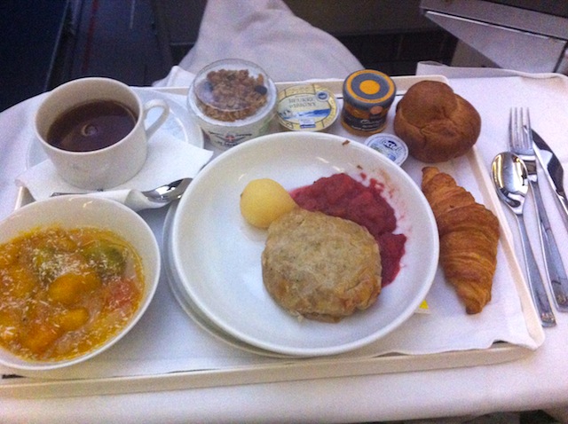 I managed to get some sleep, watched a movie, and everything was fine. I wrote. I read. I blew my nose about a hundred times. When it came time for breakfast, again they were out of the other choices. I am not entirely sure why they even gave us a menu if there were no choices. The breakfast was decent, and probably the one I would have picked anyway – a Moroccan-style pear pie with caramel, berry compote, and baby pear. It was tasty, but still annoying that there was no choice.