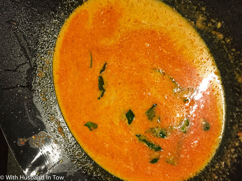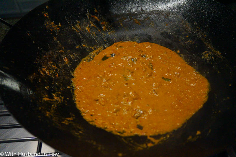 At first, there was a wok full of bright red curry sauce. As time wore on, and presumably what would happen at a slower pace if we cooked a meat for the full eight hours, the red, thin sauce started to bubble, then turn dark yellow, and ultimately a deep brown.